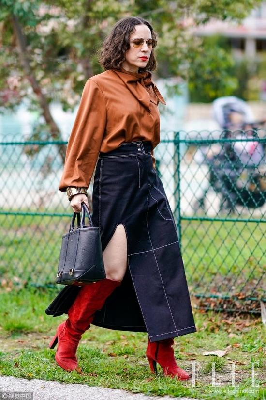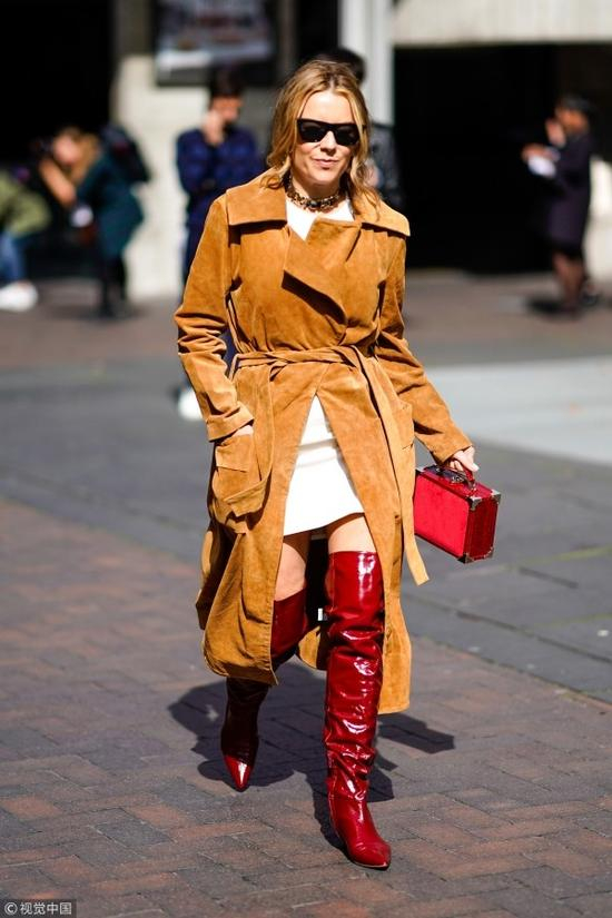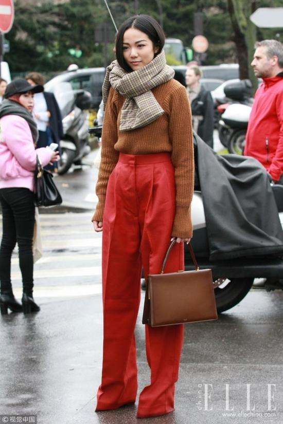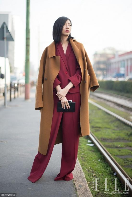 除了黑白色系搭配起来稳不出错外,喜欢靓丽色彩的姑娘还可以尝试将焦糖色单品与红色系撞色,焦糖色本就带有红色色调,所以组合起来相得益彰。