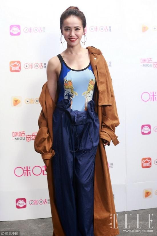 蔡依林身穿焦糖色麂皮长款大衣外套,内搭Stella Mccartney紧身吊带印花连体衣,下穿海军蓝荷叶边休闲宽松休闲裤。今年超火的纸袋裤搭配焦糖色大衣,大胆前卫。