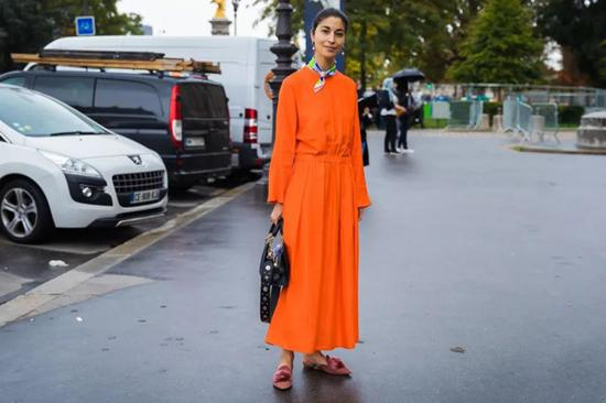 丝巾要想搭得好,配色太重要。像大面积的亮色裙装,印花丝巾面积一定不能大,小小的点缀即可。