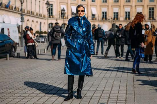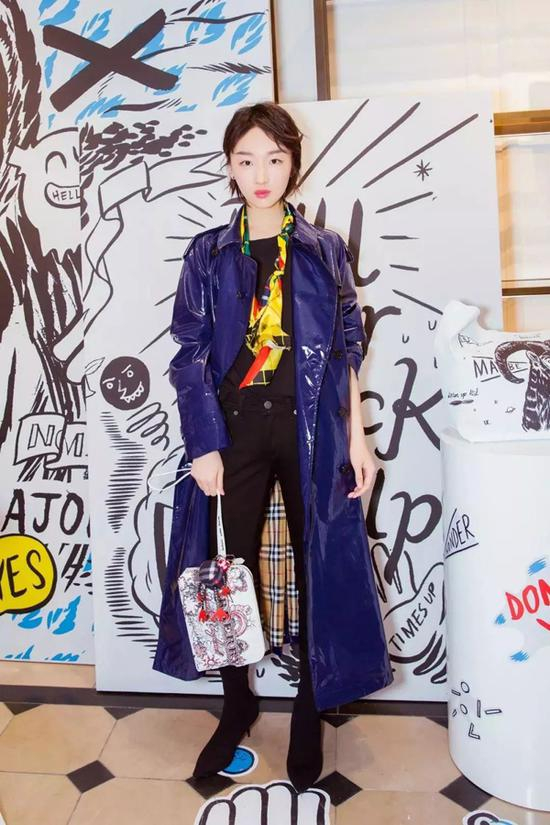 国内女明星们,好的范例也很多。比如,周冬雨用一条亮黄色印花丝巾搭配宝蓝漆皮风衣,撞色让造型亮了很多。