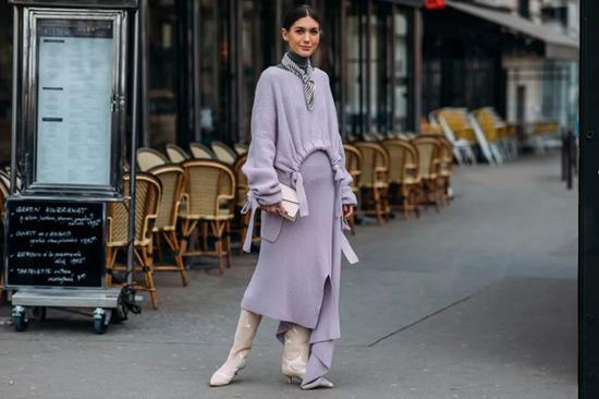 秋天,温和色系的针织套装搭配一条点睛的丝巾,是非常有气质的look。
