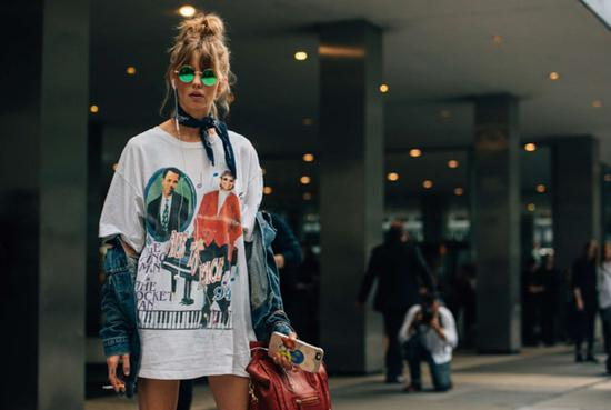 基础的老爹结丝巾系法(简单随意的系个死结),搭配简单的T恤,这样随性日常的装扮,非常容易复制。