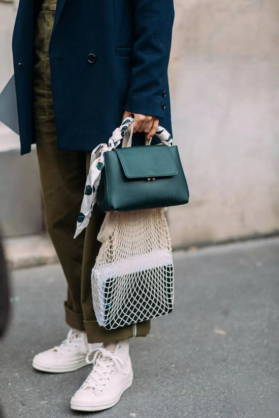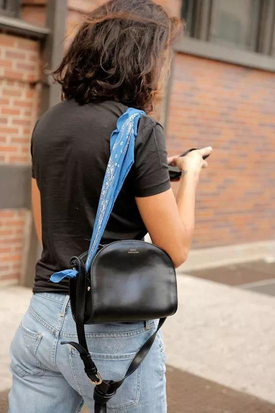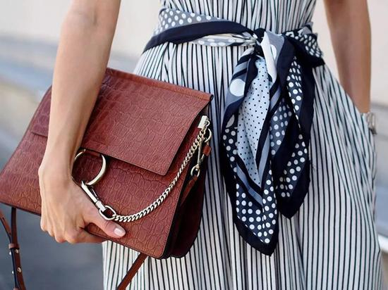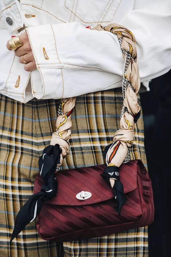 除了服装上,丝巾还可以在配饰上增加细节。许多姑娘都懂得将丝巾系在包包手柄上做装饰,瞬间就可以拥有一只“新包”。
