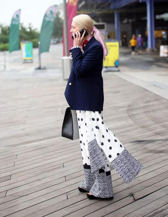 穿套装的时候,她将丝巾系在扣眼进行腰线区分,而不是全部系在腰间,这样做少了一份正式和拘谨,多了一份随性洒脱,更适合西服这样“板正”的单品。