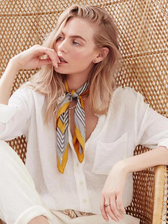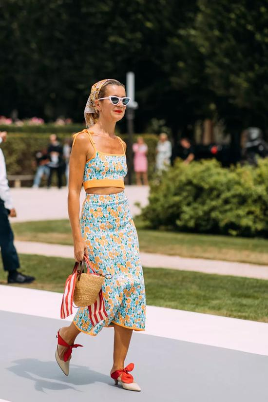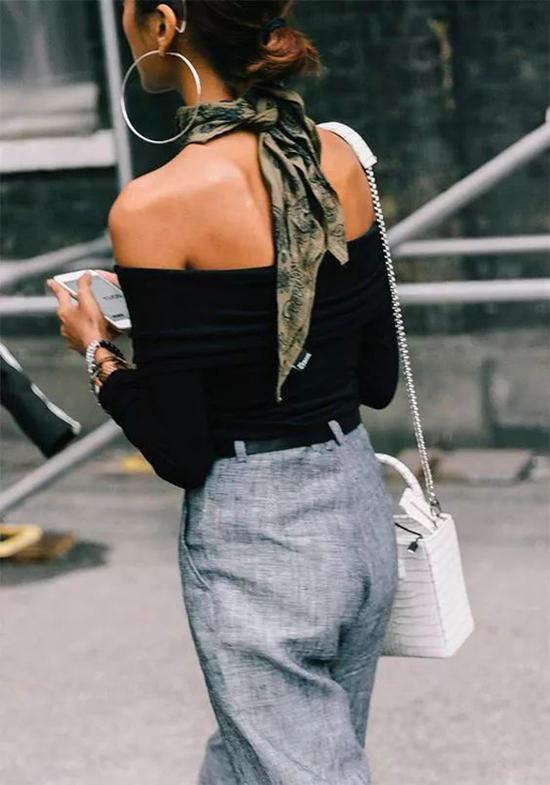 小型方巾能塑造复古优雅和少女感的风格,系在脖子上能凸显肩颈线条。