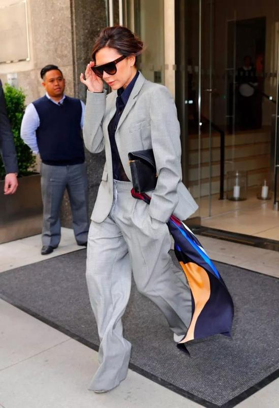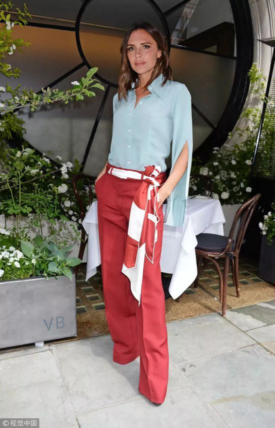 很会穿的Victoria Beckham,用丝巾做腰带,搭配她喜爱的阔腿长裤,视觉增高10cm。