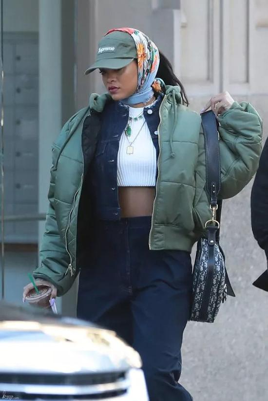 复古风正盛的当下,包头巾这种看似具有年代感的系法Rihanna也做出尝试,除了复古,还很前卫。