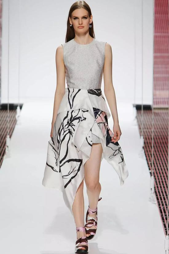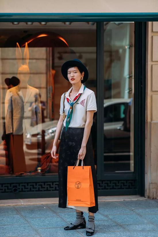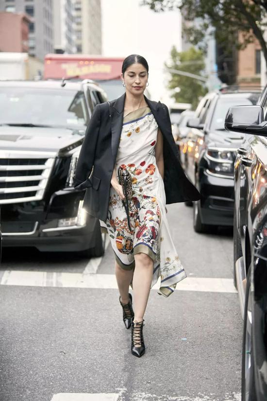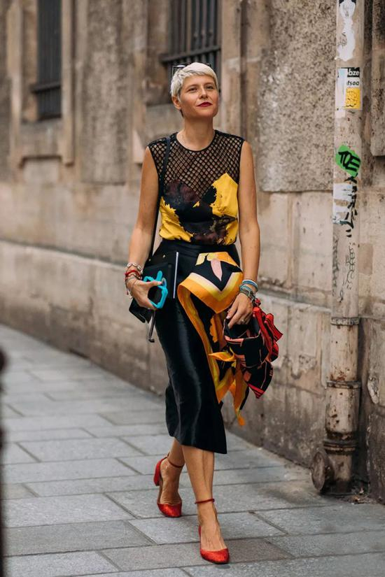 这种穿法,现实生活中也可以试试。时尚造型师Elisa Nalin穿的便是不对称半身裙,还将裙摆丝巾的一角系于手环之上,走动之间带来流动感。