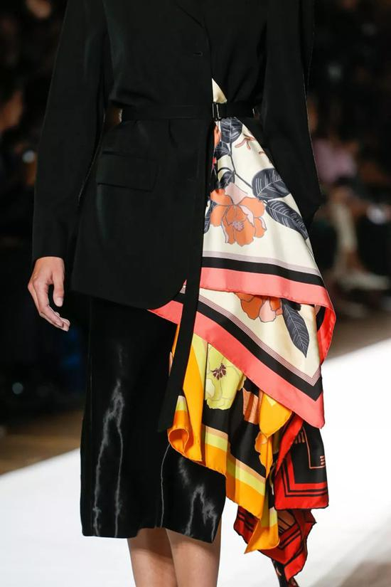 比如Dries Van Noten 的丝巾裙,色彩鲜明的丝巾从搭配的西装前襟延伸出来,不仅延续当下流行的不对称设计,也提供了一种新的穿衣思路。