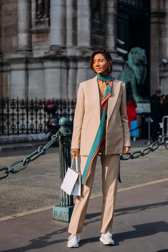 不仅是polo衫,中性化的西装套装,也可以通过彩色丝巾,变得高雅而知性,职场女性可以来一身。