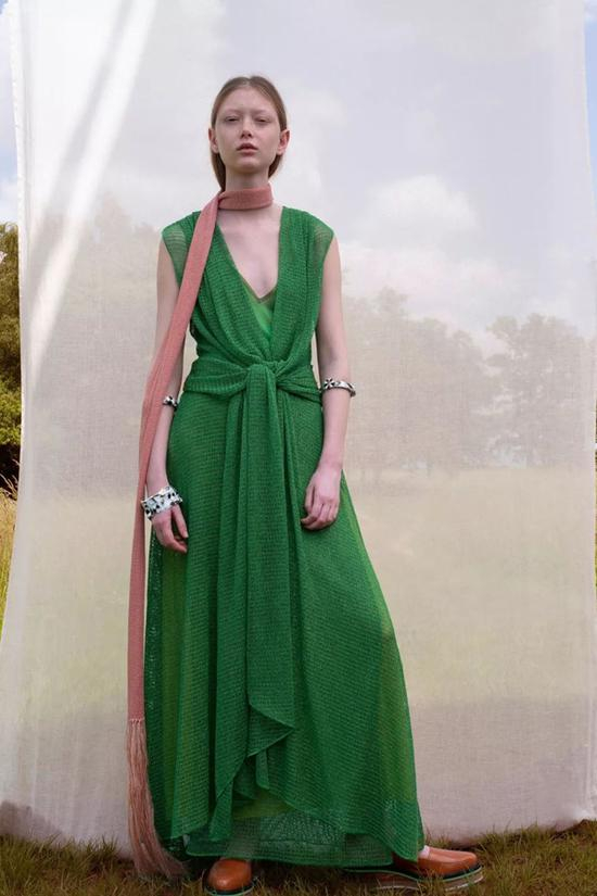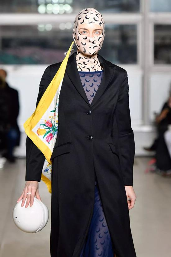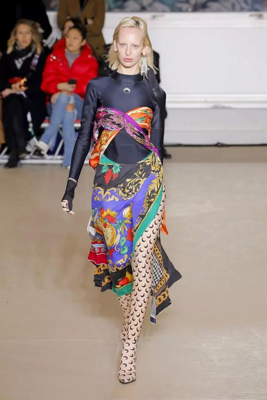 Marine Serre在2018早秋秀场中,这套丝巾造型也让人印象深刻。
