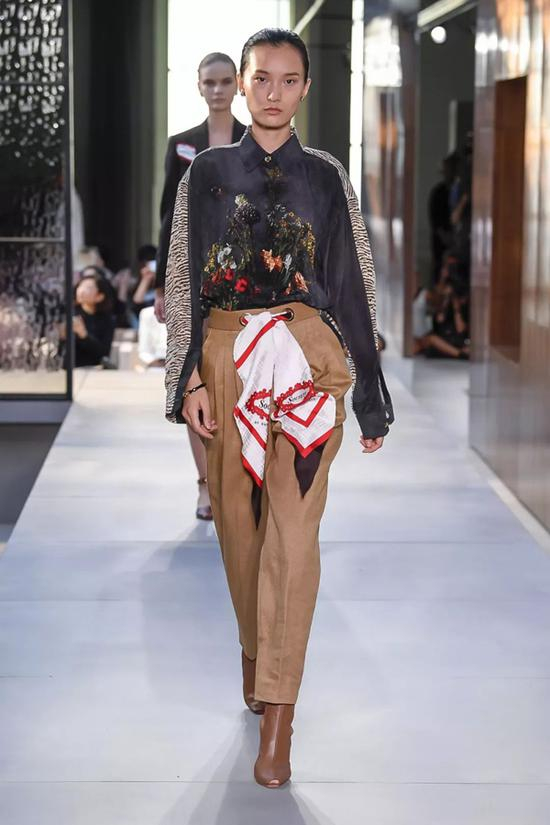 秀场上的演绎就更加天马行空一点,来看看刚刚过去的2019春夏时装周里。Riccardo Tisci设计的Burberry 19春夏系列中,将丝巾用作腰带、衬衫,各种与针织衫、外套叠搭。