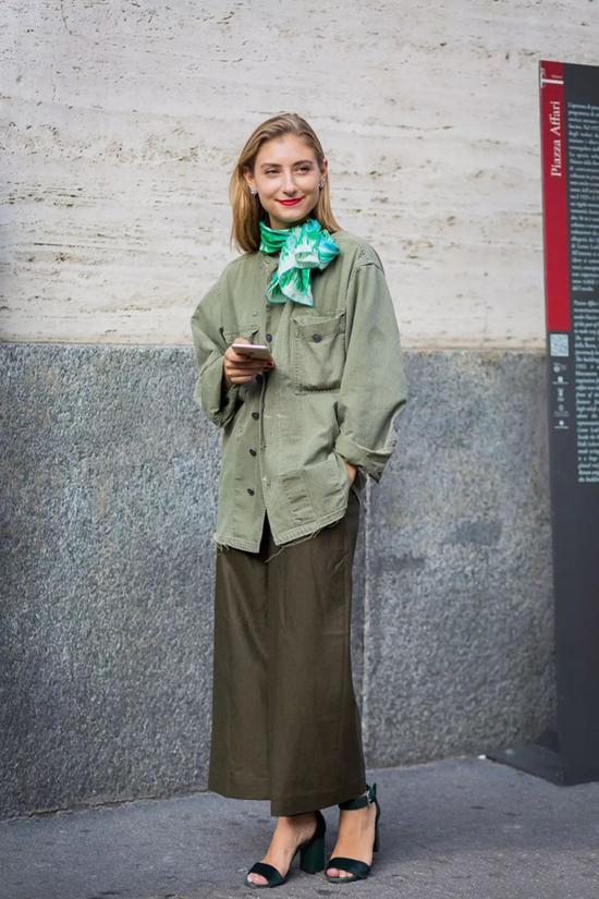 丝巾作为衣着装饰的方法还有另一种:今天没有搭配衣服的腰带,不如考虑找一条丝巾~它既可以分割出腰线,塑造好比例,本身也很好看。