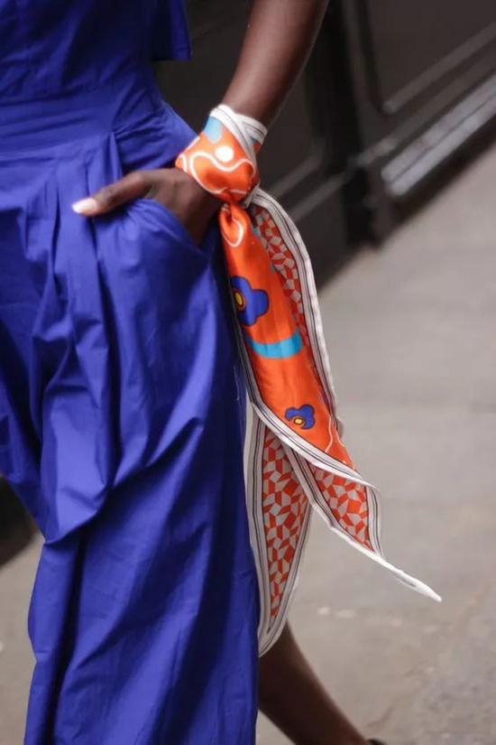 之前我们介绍过丝巾作为脖颈装饰的不同系法。但丝巾作为配饰功用远不仅仅于此,它在搭配中的可能性是越来越高了。