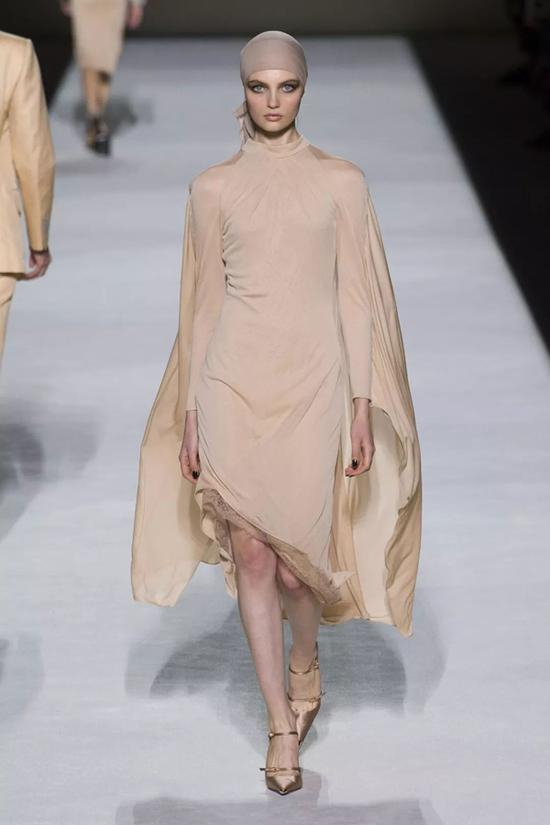 Tom Ford 19春夏系列,利用单色丝巾作为头巾。