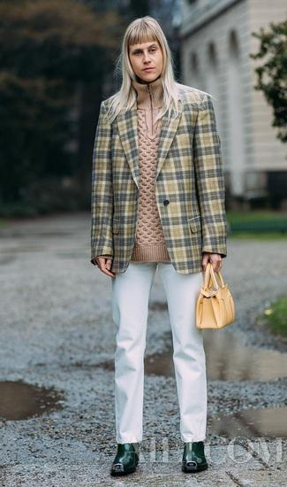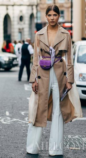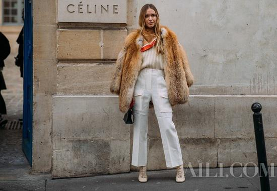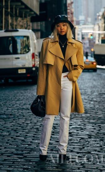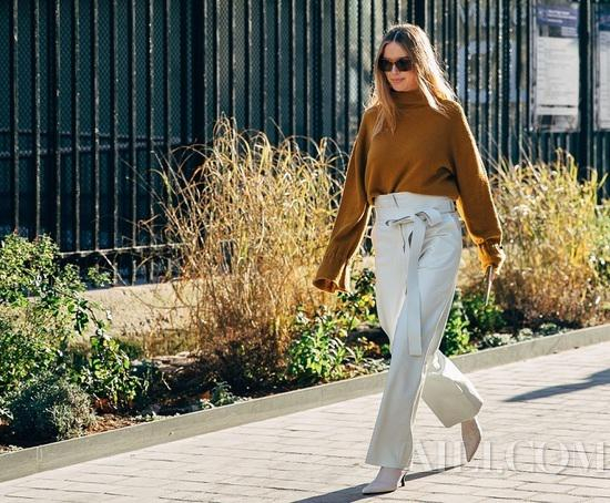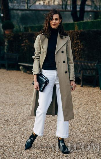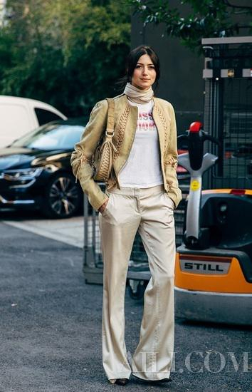 白色长裤非常适合与驼色搭配,减轻整身搭配的厚重感,是非常符合春天的色彩设定。