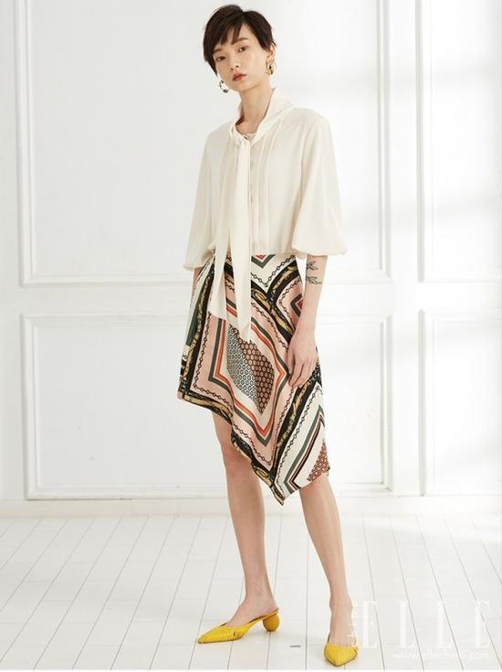 想让造型丰富一些又怕太繁复的话,这种飘带白衬衫很适宜。像尤为Wconcept上这件HOWL的褶皱衬衫,本身就有纹路,搭配上艺术格纹的半裙,再用柠檬黄的鞋子点睛即可。