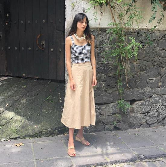 配饰设计师Alexa de la Cruz 素雅的裸色半裙和裸色Tere sandal相呼应,演绎起优雅的法式风情也是完全没问题