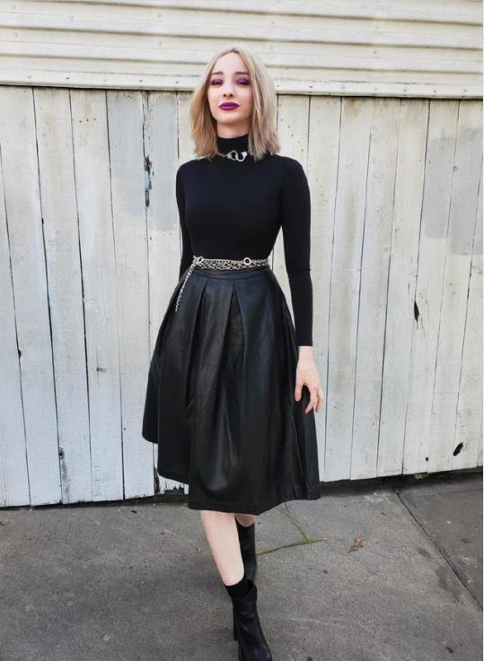这身裙装被她穿得很帅气,黑色的紧身毛衣和皮裙,对一个身材很好的小姐姐来说就是时尚的利器,腰间的银色链子腰带朋克摩登,一身深色穿搭十分个性,还是我们熟悉的那个北极星啊!