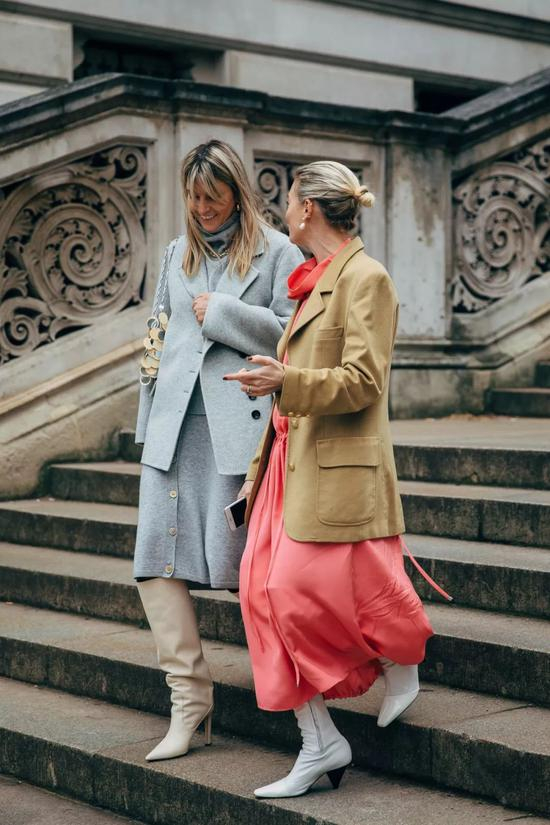 驼色可以与亮眼一点的颜色搭配吗?没有问题。只要选择饱和度相同的颜色,并且保证全身不出现超过三种大面积的颜色就OK。图中驼色西装内搭珊瑚色连衣裙,和白色靴子的造型就很和谐。