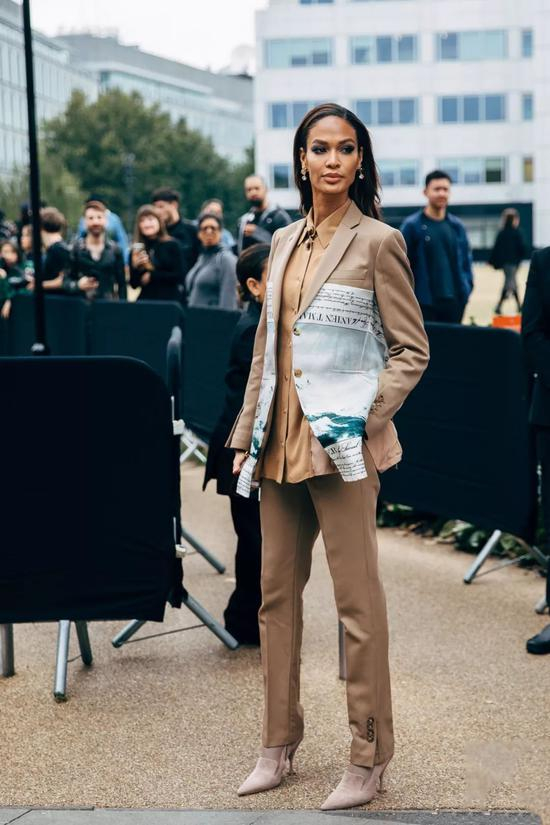 Joan Smalls不愧是超模级的人物,这样从头到脚一身的驼色能被她穿的很有层次感。驼色的衬衫选择放在裤子外面而不是扎进裤子里,这样的穿法本身就多了份随性,正好匹配她同样休闲的报纸印花西服外套上。尖头的跟鞋在视觉上又有拉伸的作用,完美的弥补了因为衬衣放在外面所掩盖掉的一部分长度。