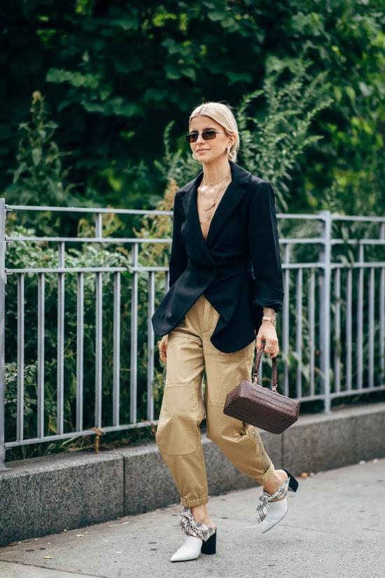 今年很火的工装裤就是不错的选择。谁说工装裤只能搭配休闲风?和正式一点的西服高跟鞋混搭在一起也很好看。还有值得一提的是,博主空身穿西装,用项链叠拼做装饰的穿法实在太Chic了。