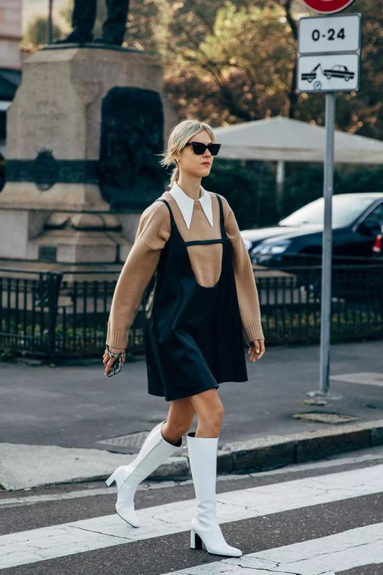 很大气的驼色也可以配合可爱一点的造型,毛衣外面翻出的白色复古大尖领与长靴呼应,再穿上宽松版型的连衣裙,藏肉效果一级好。