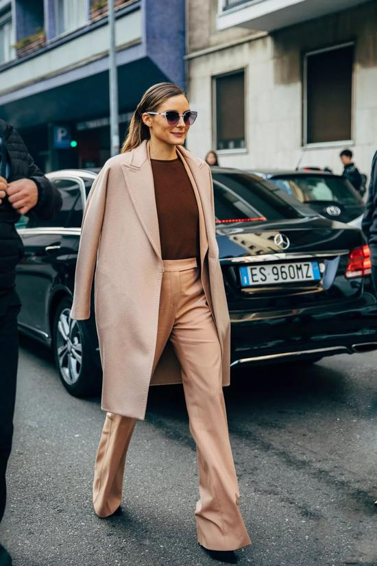 纽约名媛Olivia Palermo的四件套装叠穿同样精彩,西服上装的大面积同色让她很有想法的用另一款颜色稍浅的驼色大衣盖住,减少颜色重复性的同时,披着大衣的穿法又能使气场变得强大。