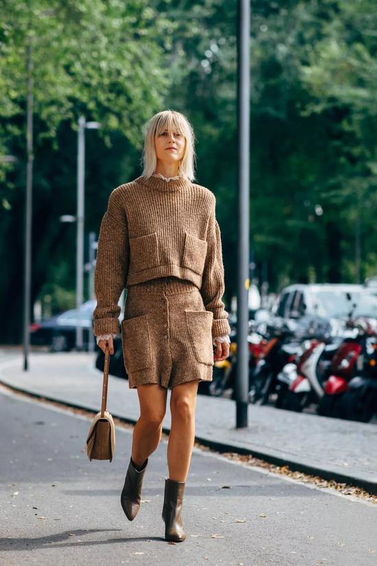 针织套装是我们秋冬最省事省力的一身Look了,不用太多的思考,就能拥有冬天的时尚,搭配一双同色系的踝靴,会让整身的针织多了“大牌感”。