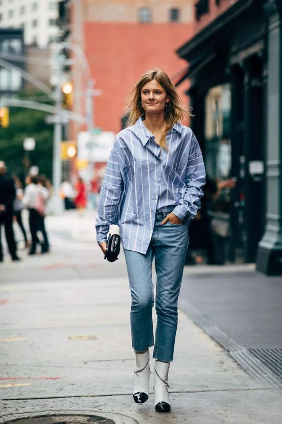 九分裤和踝靴简直是“天生一对”,无缝衔接保暖腿部就能让你“养生”出街。白色的踝靴和浅色的牛仔裤搭配起来清清爽爽的,收紧线条的及踝靴让整体看起来还显瘦不少。多说一句,金属链条的元素今年也是热点哦~