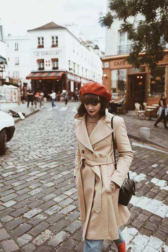 利用同色系搭配,红色贝雷帽,瞬间提升整体的摩登复古气质