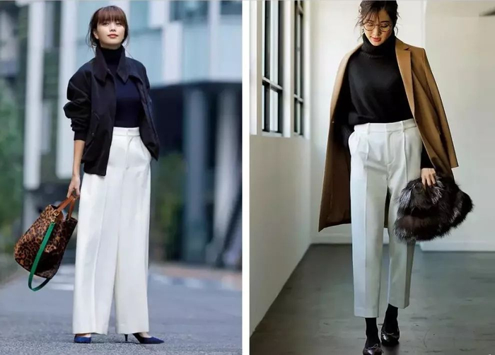 冬天常常爱穿的黑白造型look,换成白色阔腿裤加持,会比我们常配的打底裤更加轻盈休闲