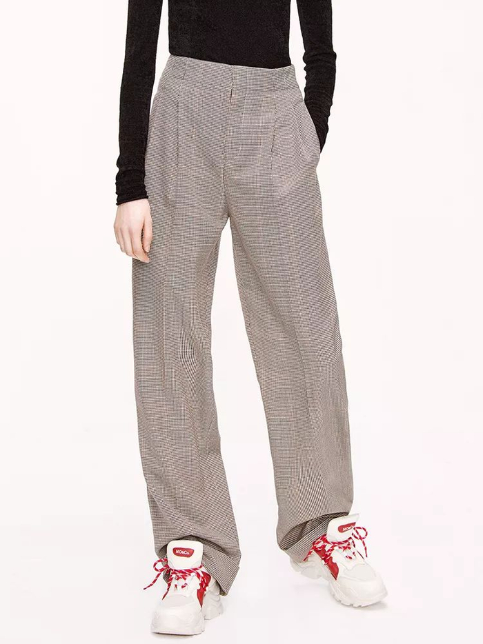 想要更多变化的,不妨挑选棕色格纹阔腿裤,这样即便搭配基础款,也会与众不同一些