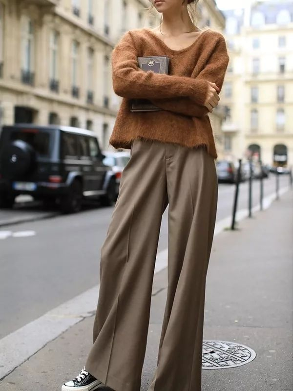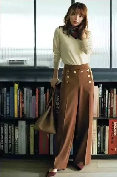 棕色阔腿裤无疑会更加吸睛出挑,在秋冬与大衣搭配,也是非常显气色的类型