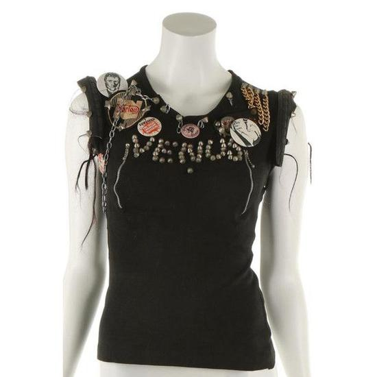 Vivienne Westwood 在她 2014 年出版的一本自传中说:“ T 恤的形状是如此简单美观,它就像是穿在身体之上的画布一般”。她曾将 T 恤的袖子裁掉,用别针把徽章固定在在 T 恤上,再饰以亮片和链条这些小东西。比较标志性的包括了一件黑色的用鸡骨头拼成了‘Rock’字样的 T 恤,以及另一件用铆钉拼成了‘Venus’的 T 恤。因为 T 恤上的装饰物可以进行替换和移动,这意味着许多人可以在家中依照自己的喜好重制它们。于是,Vivienne Westwood 在 70 年代就已为人们提供了充满 DIY 精神的美学。