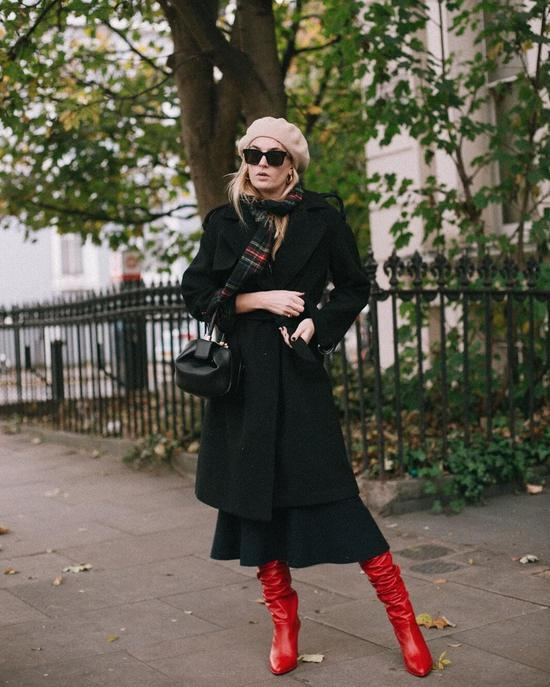 又或者用一对红色的褶皱长靴点亮整套黑色的造型。