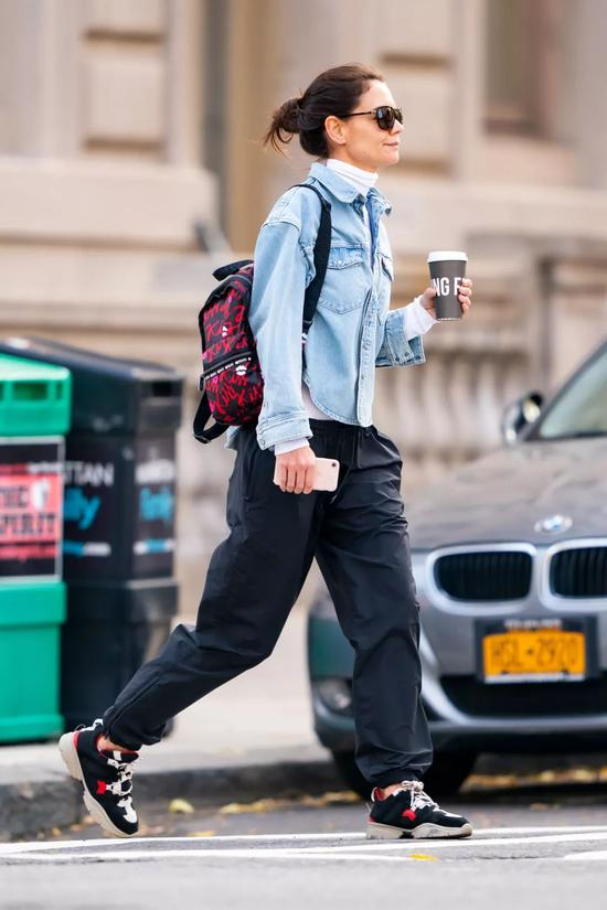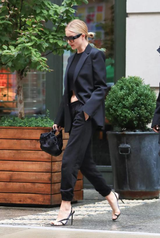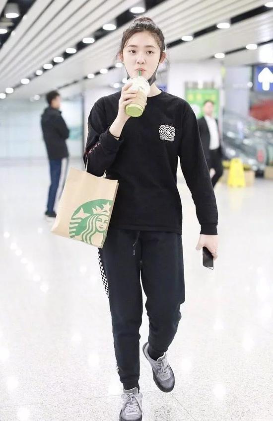束脚裤搭配起来还可以很随意。林允这样all black的穿搭,束出细脚踝再搭配一双运动鞋,“仙女”身上也有“男友力”。(这样赶飞机一定很舒服~)