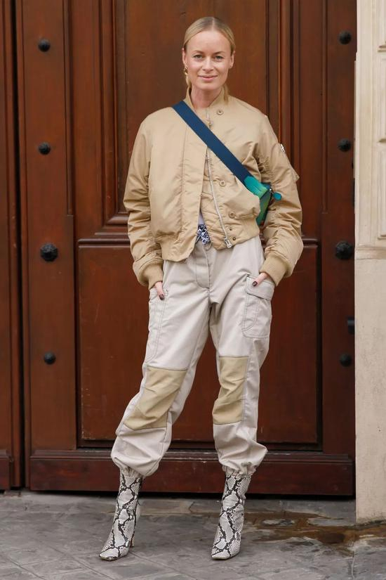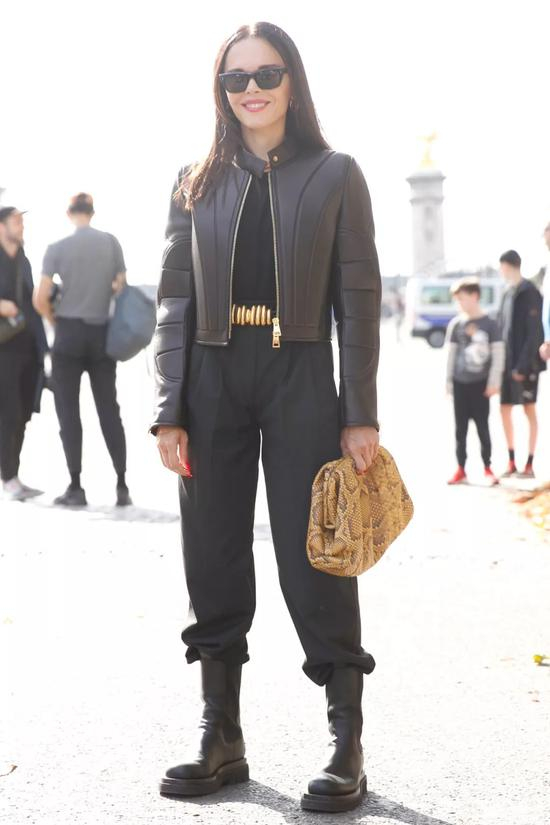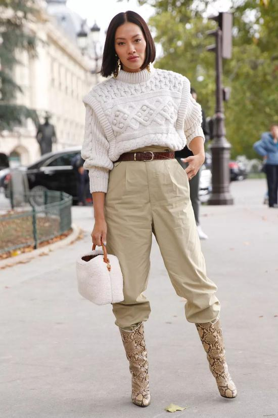 短款外套下面,浅色的束腿裤和动物纹短靴放在一起,怎么说呢,一看就很想把腿放进去.......