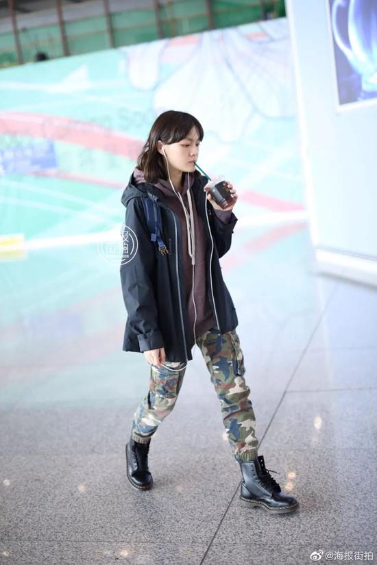 文淇妹妹选择了迷彩款式的束脚裤,搭配卫衣和马丁靴,少女也可以这么帅气!和她本人看起来就酷酷的性格也很搭。