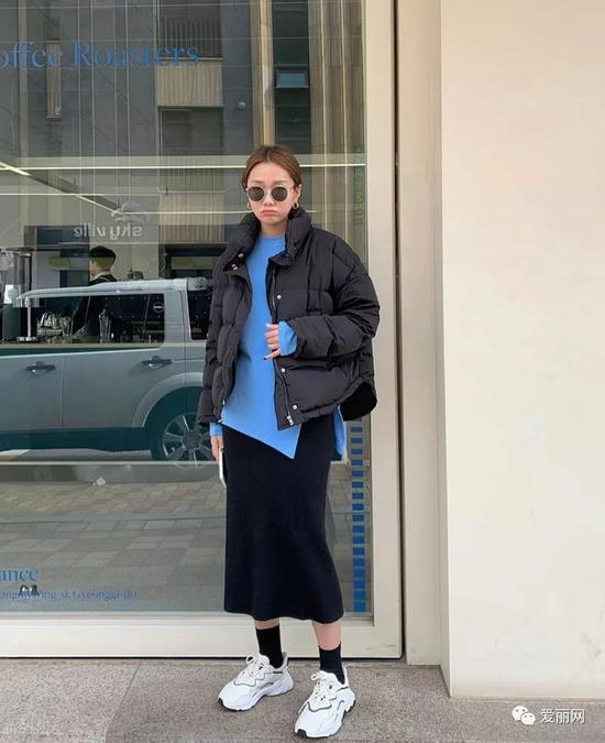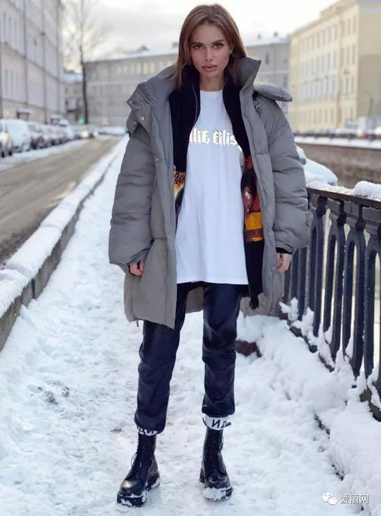 对比大廓形羽绒服,内搭可以做减法,紧身裤,高领毛衣都能与羽绒服的体积感形成对比。如果穿阔腿裤卫衣就会显得有点臃肿,个子不高的女生更是容易给人邋遢的印象。