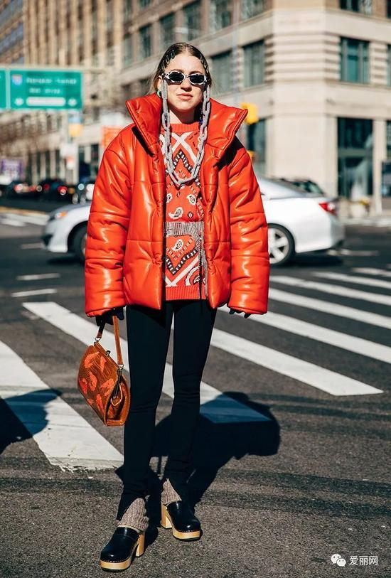 如果够大胆,可以尝试选择色彩鲜艳的短款羽绒服,打破冬日的灰暗十分合适,橘色也是适合亚洲女生的超显白配色。