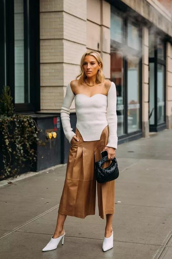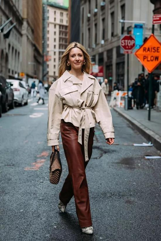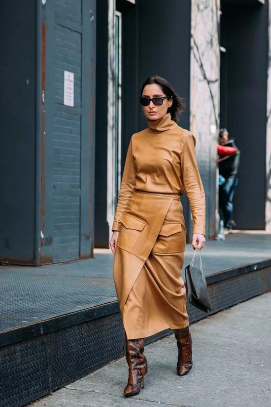 裸色皮革单品也是时装精们的爱,有质感,作为内搭不那么厚重,穿搭场景更广。