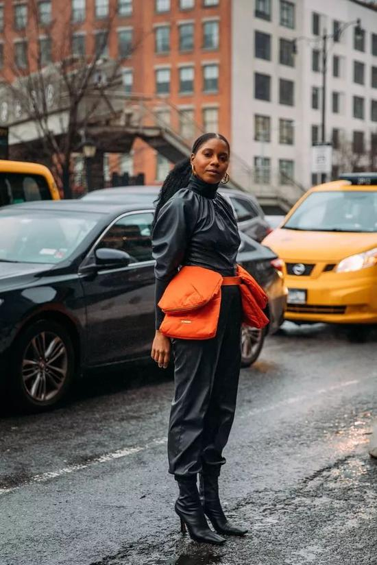 毕竟是时装周,要想让人家一眼就看得到你,得学会给自己身上加亮点。比如,黑色皮套装配荧光橙的腰包这么高调的搭配,几个人能忽视。