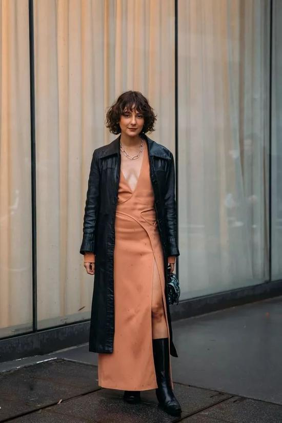 然后有一个需要注意的地方,皮大衣很“压”人,此时裙装最好能在比例上有些“作为”,能有开衩、收腰这些细节是最好的。