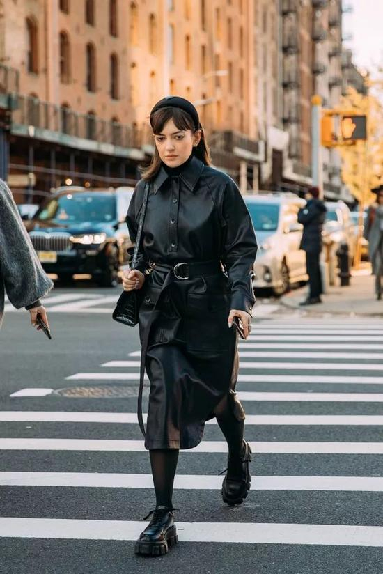 记得可儿街拍火的那几年,衬衫裙被她穿红过。但现在,那些田园风小碎花的款式略微过时了哈,看看时装周外的现在流行的,已经是皮革材质的了。