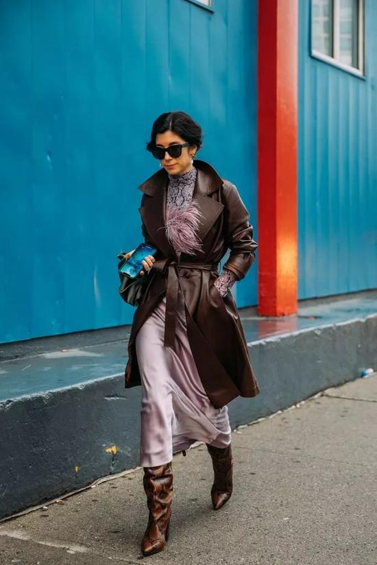 第二而种穿搭法,就是皮大衣配裙装。皮大衣这个单品倒是每年冬天都有的,今年借着皮革风,爆发了。