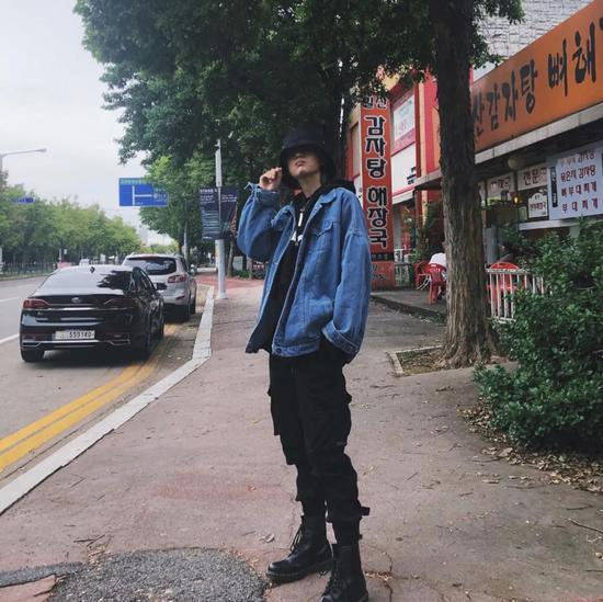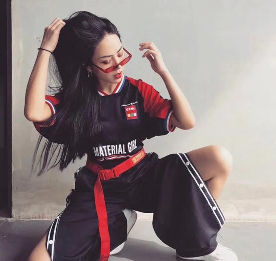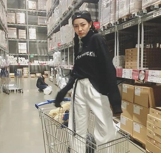 黑色是酷女孩的颜色,谢可寅的私服中到处都是黑色元素。黑色的肥裤子、黑色的卫衣,就是一酷到底。
