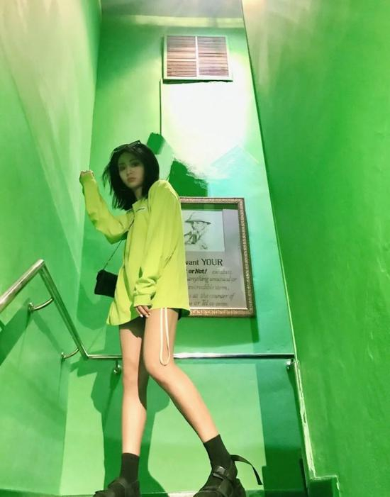 “下半身失踪”是谢可寅穿搭的常用招数。宽松的大T或者外套,选择一双略有增高的鞋子,下一步只需要露出大长腿。