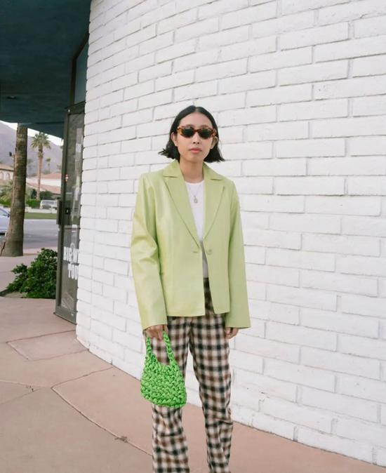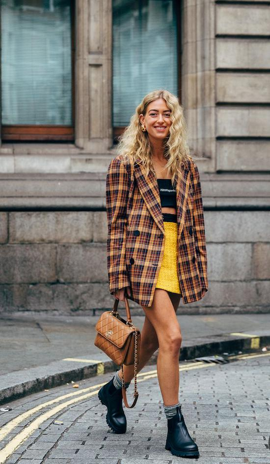 不过格纹西装是真的好搭,相比于其它的格纹款式,格纹西装真的是编辑心中复古感和时尚感最强的外套。今年流行外套里只穿一件croptop,又酷又性感。