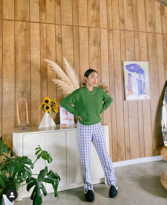 还可以只穿一件格纹长裤试试~紫色和白色放在一起,干净清爽扑面而来。搭配一件绿色上衣,撞色意外的好看!